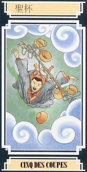 Significado geralO Cinco de copas representa uma situação triste e dolorosa. Mas também indica o começo de uma vida alternativa. |